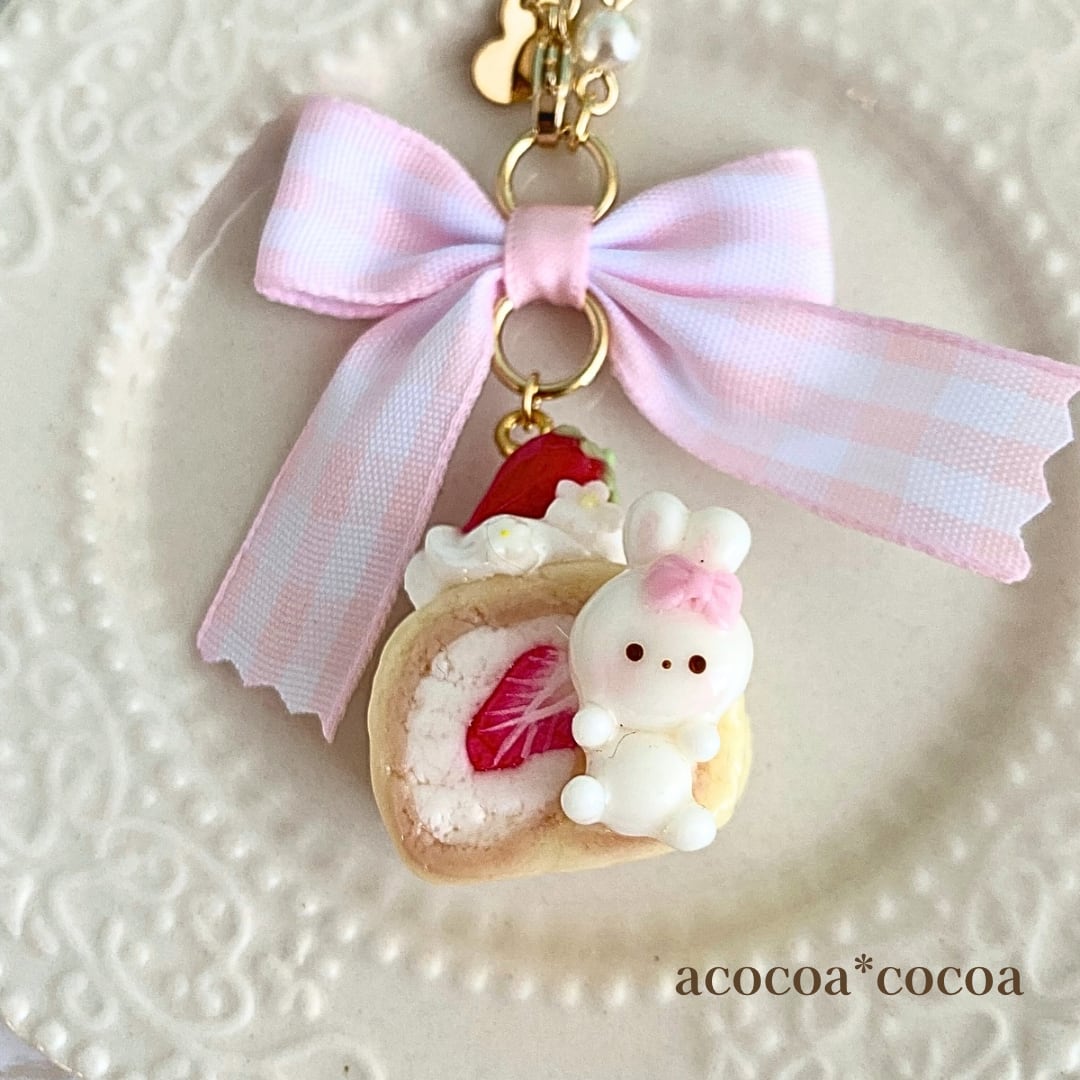 【バックチャーム】ロールケーキ(うー)は、愛らしいうさぎと美味しそうなロールケーキが一緒になった、こだわりのバックチャームです!