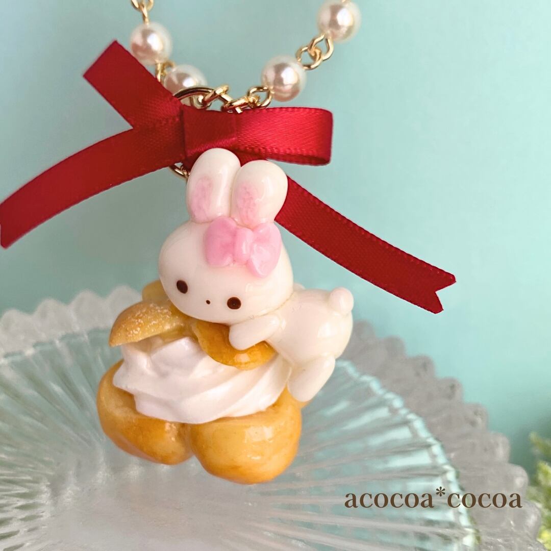 【ネックレス】シュークリーム(うー)は、愛らしいうさぎのうーがシュークリームの上にちょこんと乗った、心温まるデザインのバックチャームです!